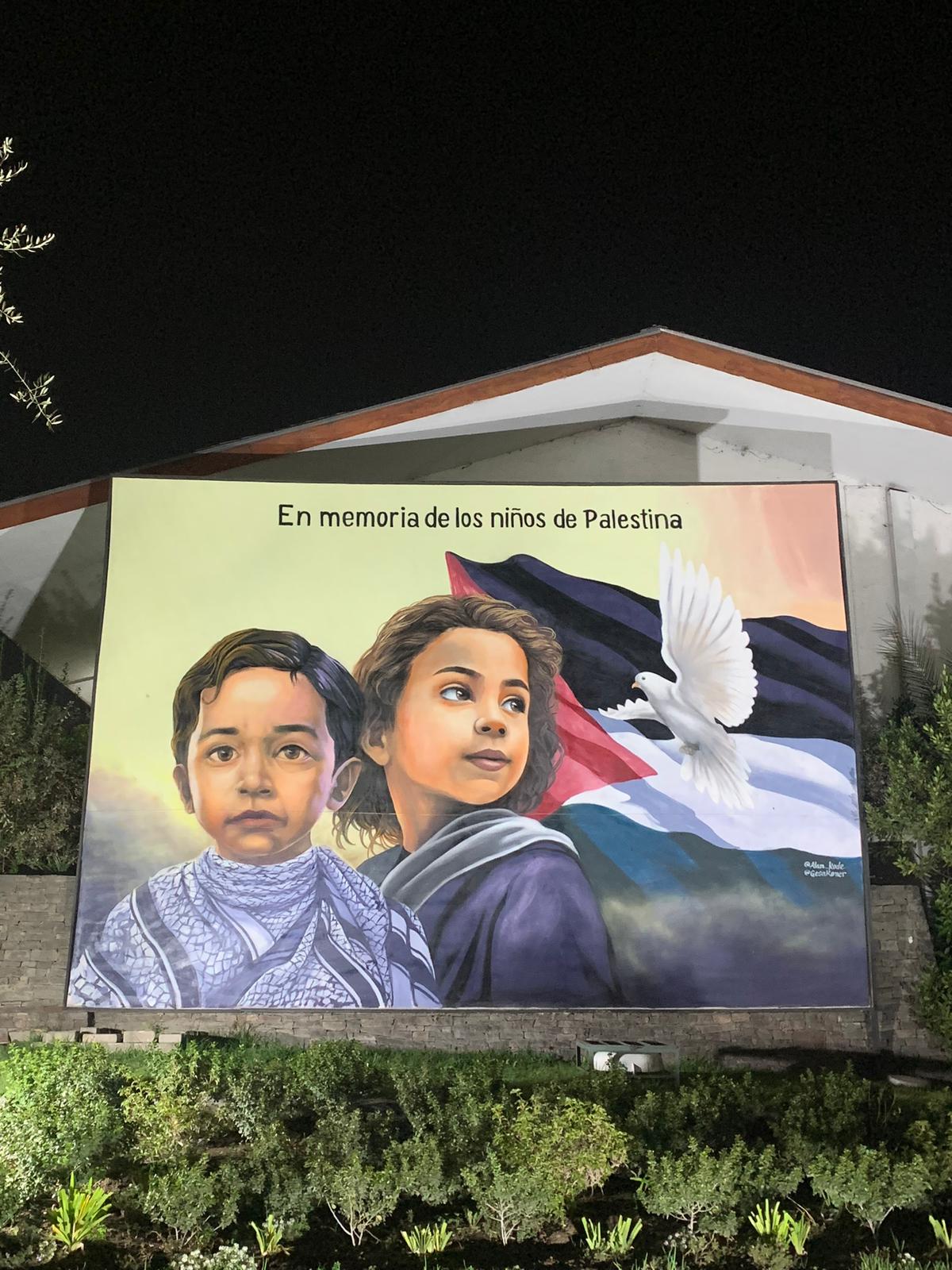 Israel’s genocide in Gaza has had a profound impact on the club and on the wider Palestinian community in Chile. The social club exhibits proud mementoes of the club’s history, but amongst them are reminders of the sustained slaughter of civilians taking place in the club’s heartland. Outside is a huge mural with two Palestinian children, the flag and a white dove behind them. Above them, written: En memoria de los niños de Palestina [In memory of the children of Palestine]